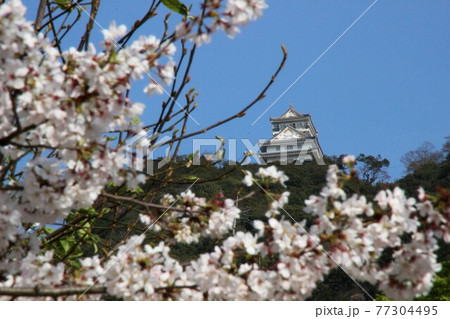 板垣退助像前から見上げる高知城天守と本丸御殿の桜
