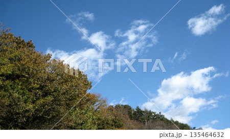 冬の晴れ間の山の上の森と青空風景