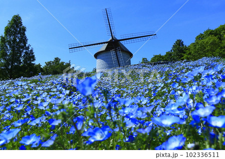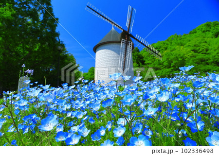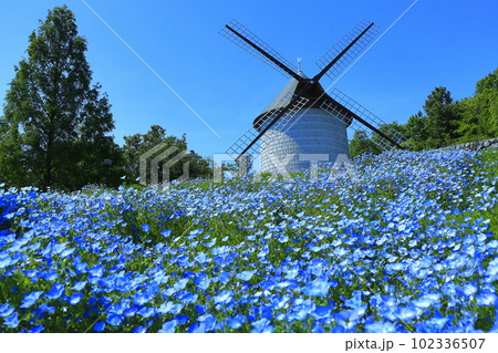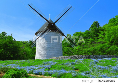 【徳島県】晴天のあすたむらんど徳島の風車の丘(ネモフィラ)