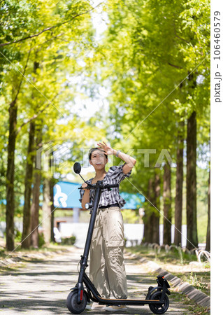 爽やかな木漏れ日の中を電動キックボードで散策する若くてかわいい女性|電動キックボードイメージ