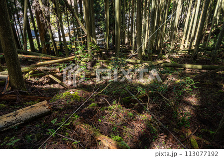木漏れ日射す鞍馬の針葉樹林 京都市