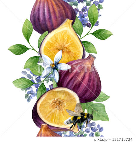Watercolor border of figs, leaves, flowers and bumblebees. Good for postcards, recipes, menu, invitations, greeting cards.