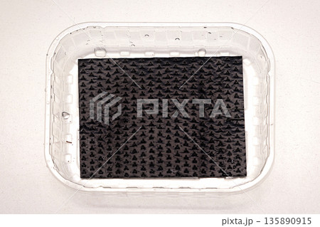 Dried mango slices in disposable plastic packaging tray