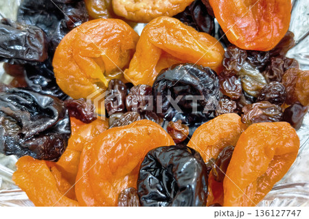 A variety of dried fruits are arranged in a clear bowl, showing apricots, prunes, and raisins. They are ready to be served at a casual gathering
