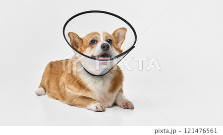 Purebred dog wearing protective collar lies down with its head slightly tilted. Its mouth open, expression joyful against white background.