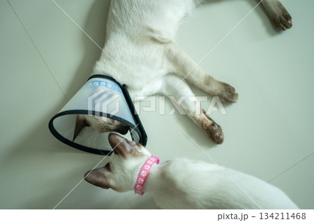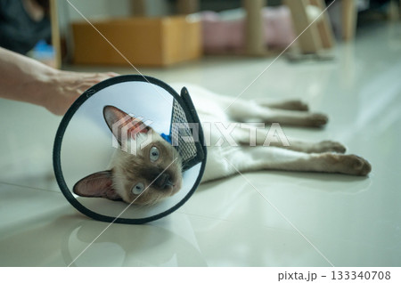 Siamese cat wearing Elizabethan collar for recover after surgery.