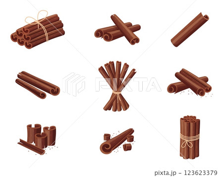 Cartoon isolated cinnamon sticks. Tasty spices for dessert, baking, coffee. Organic herbal bunches of cinnamon. Nowaday raw cooking vector ingredients