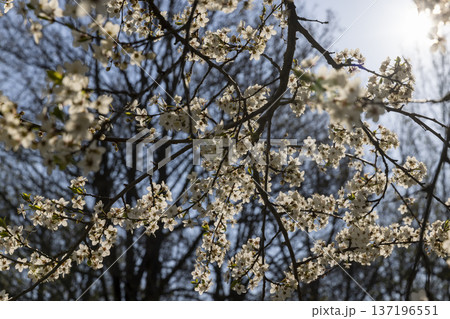 Small beautiful white sweet cherry blossoms in sunny weather in spring season, large number of fragrant white cherry blossoms in bright sunshine in spring