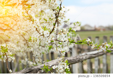 Spring Blossom by the Fence. Hello spring background. A close-up shot of a fruit tree branch covered in delicate white blossoms and fresh green leaves. Spring card
