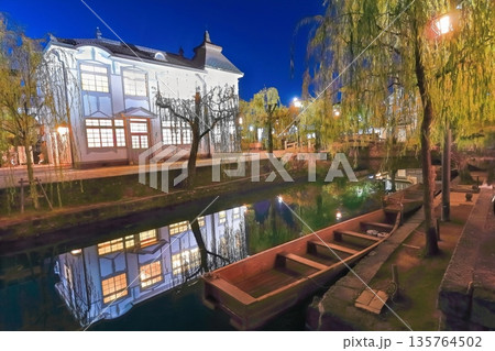 朝焼けに染まる城崎温泉の町並み 風情ある枝垂れ柳