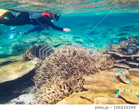 八重干瀬のサンゴ礁をスノーケリングする女性