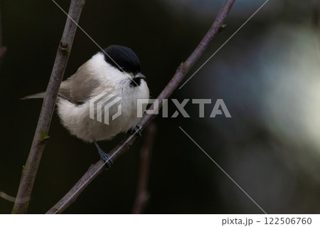 Cute bird The willow tit, song bird sitting on a branch without leaves in the winter. dark background