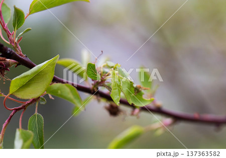 Dry and frostbitten apple tree flowers and leaves, close-up