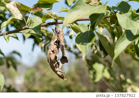 Apple tree branch showing shriveled, rotting apple withered brown leaves symbolizing decay agricultural disease. Crop infections