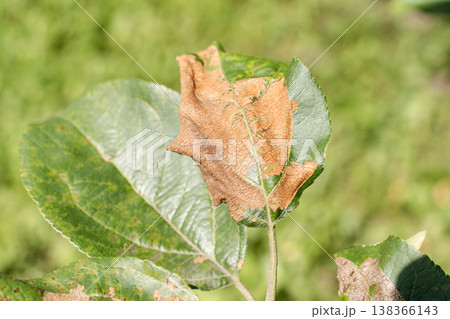 Apple tree leaf damaged by disease or pest, with brown dry spots from fungal infection or insect activity. Agricultural issues, climate impacts