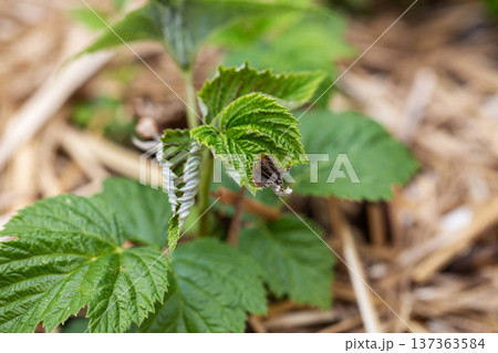 Frostbitten leaves and raspberry bushes spring, close-up