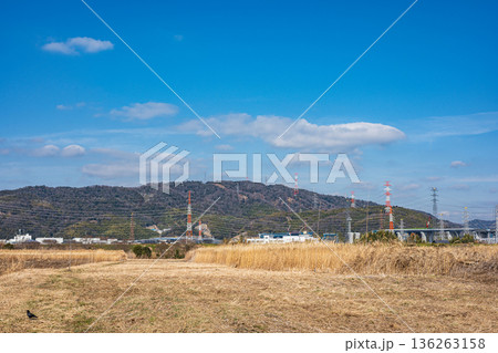 淀川右岸河川敷に立つ送電線鉄塔 大阪府高槻市