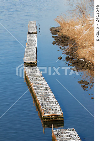 荒川の雪景色と柵の上で休憩する野鳥