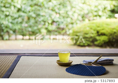 【和風素材】和室にて畳のアップと庭の風景のボケ