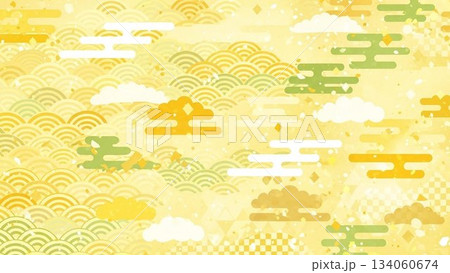 松竹梅や伝統模様が描かれた黄色の華やかな和風背景素材