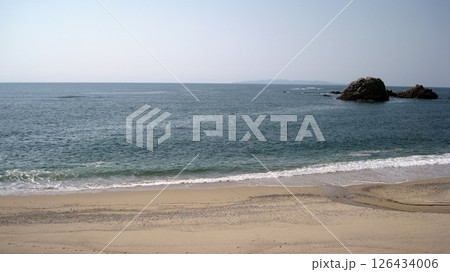 快晴の青空と青い海と白い砂浜と奇岩と