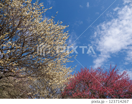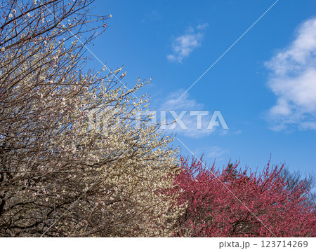 早春の青空と梅園の梅の花【千葉県柏市 あけぼの山農業公園】