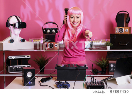 Asian dj listening techno music at headphones while mixing song at professional mixer console, having fun with fans in club at night. Artist with pink hair doing performance with audio equipment