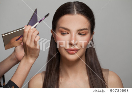 Beautiful female model face closeup and makeup artist hands with brush and eye shadow palette