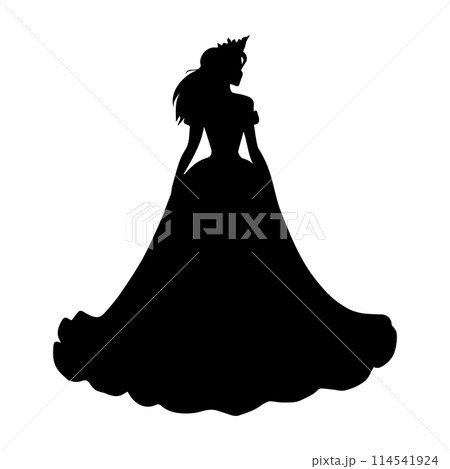 the silhouette of a princess in a long fluffy dress with a crown on her head.
