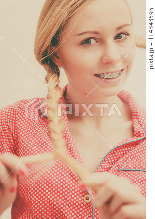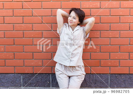 Cheerful woman in home wear pajama outdoor brick wall background emotions copy space and empty place for text - sleepwear and homewear concept