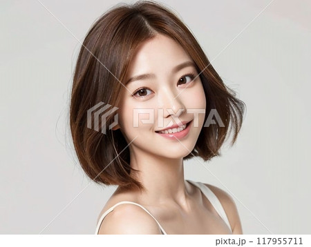 Korean woman showcasing natural beauty with glowing skin and soft makeup in a light studio setting