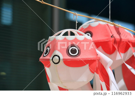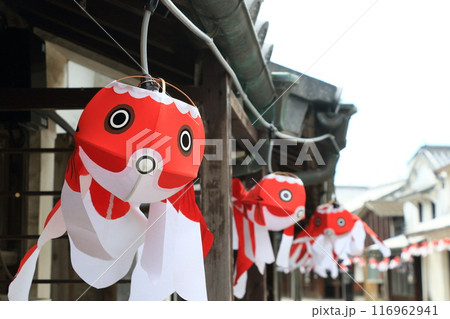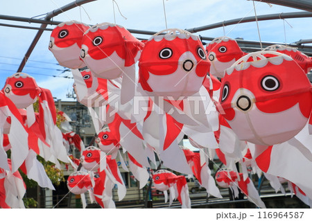 青空に泳ぐ金魚提灯 柳井市の伝統工芸品 観光地の町並み