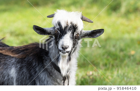 Goat in a clearing with grass. Goat walks through the yard of a country farm.