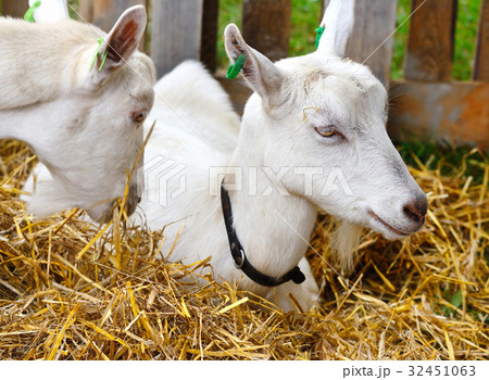 A white goat of the Zaanen breed on a dark background in the barn window. Profile photo. Concept: lifestyle, home farm, goat breeding, animal husbandry, ecological product.
