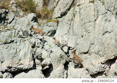 mountain landscape - sheer cliff with two chamois and wooded slope