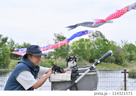 チワワと散歩する飼い主の男性 こいのぼり 埼玉県・白岡市(柴山沼)