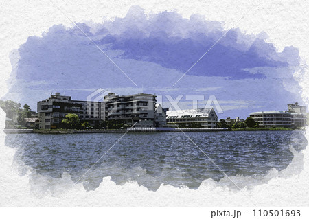 水彩画風 加賀片山津温泉 柴山潟と温泉街 石川県加賀市