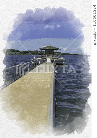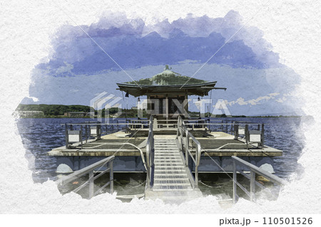 水彩画風 加賀片山津温泉 柴山潟 浮御堂 石川県加賀市