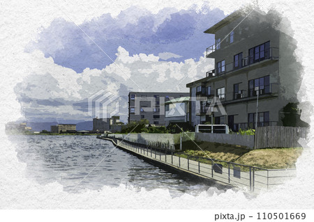 水彩画風 加賀片山津温泉 柴山潟湖畔遊歩道 石川県加賀市