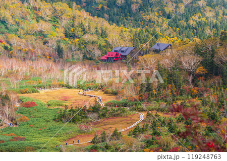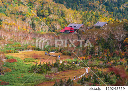 秋の栂池自然園 旧栂池ヒュッテと青空 【長野県】