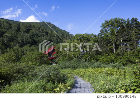 長野県北安曇野郡の6月の栂池自然園のミズバショウと木道と栂池ヒュッテ