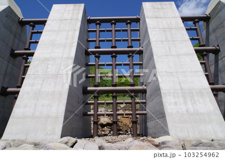 信州 小谷村の砂防施設 栂池沢3号砂防堰堤 鋼製スリット3連格子枠の大型堰堤