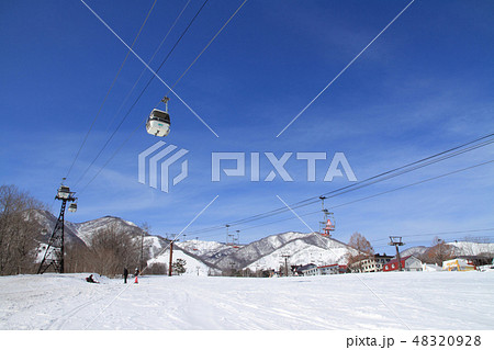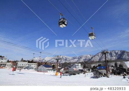 快晴のゲレンデと青空を背に上るゴンドラ (長野県、白馬、栂池高原)