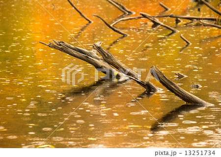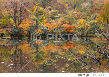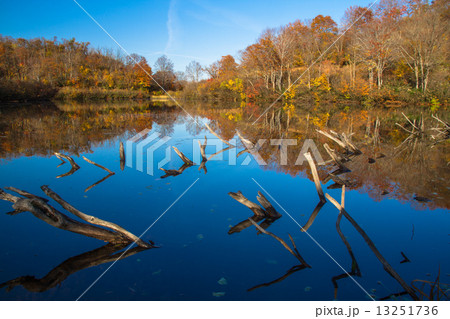 新潟県長岡市・道院高原 池から突き出た枯れ木と鮮やかな紅葉風景
