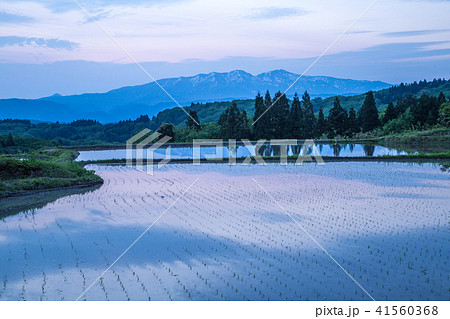 新潟県長岡市 田植え後の棚田と粟ケ岳の美しい朝焼け