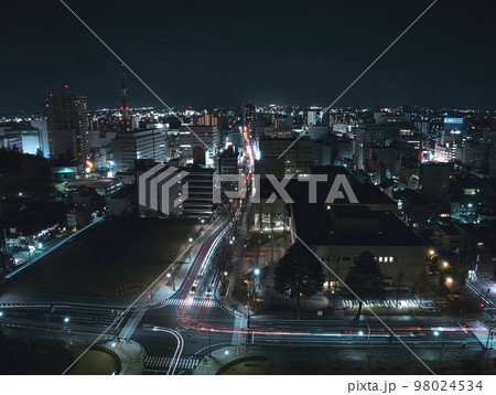 栃木県庁展望ロビーから見た宇都宮市役所を含む市中心部の夜景、画面右中央付近に東京スカイツリー