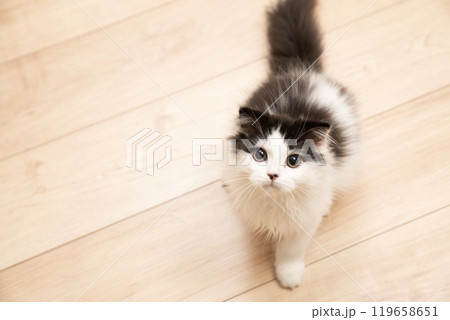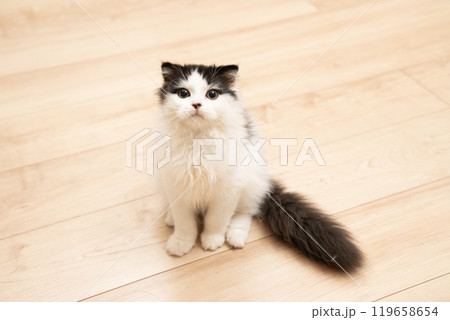 お座りしてカメラを見るスコティッシュフォールドの仔猫