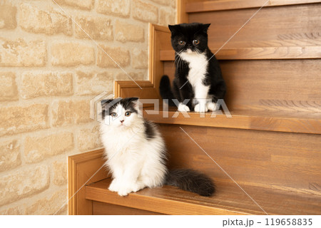階段でお座りしてカメラを見るスコティッシュフォールドの仔猫