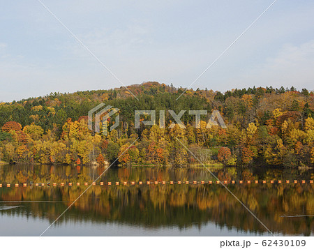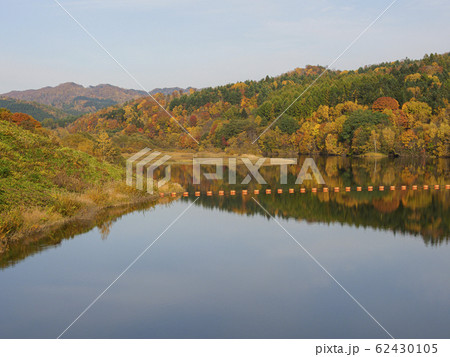 紅葉の木々と栗山ダム 青い湖面とブイ