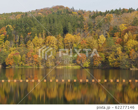 紅葉の木々と栗山ダム 映り込む木々 半々